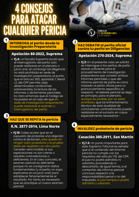 Aquí te comparto, 04 líneas jurisprudenciales claves, es decir, estos criterios no son teoría: son armas legítimas respaldadas por la jurisprudencia suprema y que todo defensor técnico debe dominar. Si la fiscalía pretende condenar con una pericia, tú puedes atacarla así: